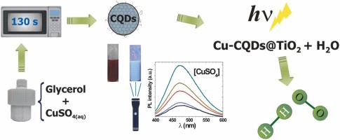 Abstract: Carbon quantum dots (CQDs) have recently attracted attention across various fields due to their small size, high conductivity, fluorescence emission, low toxicity, and other desirable characteristics. In this study, highly fluorescent CQDs with an average diameter of 3.7 nm were prepared via microwave irradiation using a standard commercial microwave oven and glycerol as solvent. Several cation promoters were examined for CQD synthesis, with copper ions ultimately chosen for comprehensive characterization and application. The CQDs were impregnated onto both commercially available and microwave-synthesized TiO2 nanoparticles. The photocatalytic activity was evaluated with respect to the hydrogen and oxygen generation. Under the employed conditions, the oxygen evolution reaction (OER) exhibited over 12 times higher efficiency than the hydrogen evolution reaction (HER). The enhanced OER activity is attributed to the high electronic conductivity of the small Cu doped CQDs@TiO2 (Cu-CQDs@TiO2) facilitating an efficient electron transfer for the OER . Visible light activity (λ ≥ 400 nm) was demonstrated by photodegradation of the indigo carmine (IC) solution used as a model pollutant. Irradiation in the presence of the Cu-CQDs@TiO2 photocatalyst resulted in complete degradation of the dye in less than 3 hours. The results presented here provide a promising methodology for designing high-performance photocatalysts based on environmentally friendly CQD syntheses. Crucial applications, from renewable energy production to environmental remediation, will benefit from strategies using the carbon abundance on Earth.