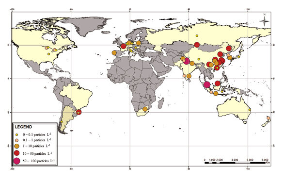 Abstract: Ecotoxicological studies involving microplastics (MPs) conducted on a laboratory scale may not always accurately mirror real environmental conditions (types, sizes, shapes, and concentrations of MPs). This review primarily focused on examining studies that investigated the prevalence of MPs in freshwater environments and accumulation in organisms worldwide, considering important factors such as morphology, particle size, and the specific polymer types involved. This review also encompassed ecotoxicological studies related to MPs, and ecological risk analyses were carried out based on the obtained ecotoxicological data. Based on the extensive dataset collected, we determined the hazardous concentration for 5% of the tested organisms (HC5) and estimated for the first time a predicted noneffect concentration (PNEC) value for two distinct types of MPs polymers: polystyrene (PS) and polyethylene (PE), based on the species sensitive distribution (SSD) curves obtained from nonobserved concentration (NOEC) values, with 0.003 mg L−1 for PS and 0.011 mg L−1 for PE. Furthermore, another PNEC value for 7 types of MPs (PE, PS, polyvinyl chloride, PA6, polyester, polyethylene terephthalate, and ethylene acrylic acid copolymer (EEA copolymer)) was calculated (0.0027 mg L−1 or 2.61 particles L−1). Subsequently, the risk quotient (RQ) was computed utilizing data obtained from the measured environmental concentrations of 18 places. An RQ value of 0.094 was obtained, inferring that MPs have a low-risk potential globally. However, when the RQ values were examined for each country separately, they exhibited significant variability (RQ = 22.06 in Malaysia and 0.000008 in Australia). Overall, this review provides a comprehensive overview of the current knowledge on MP abundance in freshwater environments, the associated ecotoxicological research to reinforce the outcomes derived from the risk analysis, and their accumulation in biota.