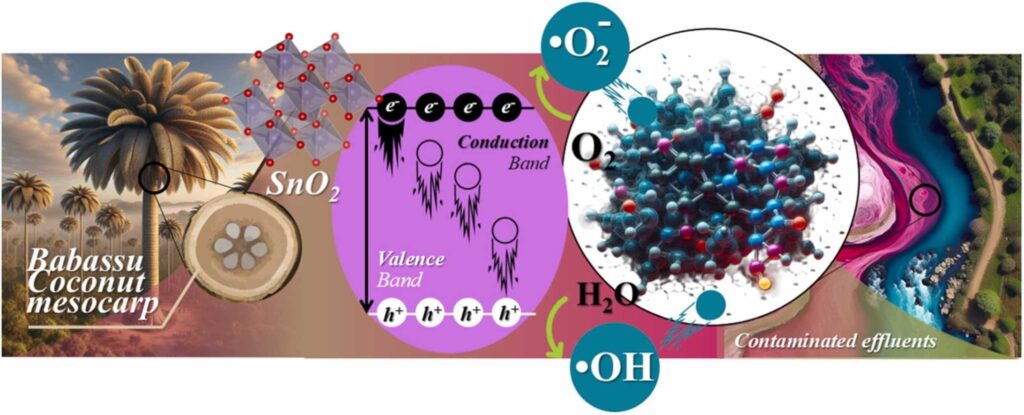 Abstract: In this work, pure SnO2 nanoparticles (SnO2 NPs), doped and co-doped with Co2 + and Nb5+ (0.05 and 0.1 mol), were prepared using babassu mesocarp (Orbgnya Speciosa) extract as a natural polymerizing agent and microwave-assisted hydrothermal treatment. X-ray diffraction analysis (XRD) showed that the crystallinity of the NPs increases by more than 20 % in the presence of babassu mesocarp, and the particle size decreases from 260.50 nm to 18.88 nm even with doping Co2+/Nb5+. The photocatalytic activity under UV irradiation for the degradation of the rhodamine b (RhB) dye showed that the NPs produced with the mesocarp achieved a degradation of up to 90 % and 97 % of RhB. The Co2+ doped samples were evaluated for their ability to degrade emerging contaminants such as Ofloxacin (OFX) and Diclofenac Sodium (DCF) in domestic wastewater. The assays showed that even in the presence of natural organic matter, the catalysts efficiently absorbed UV-C light to produce the oxidizing species consumed in the degradation of organic contaminants. This antibiotic showed high resistance to photolysis but degraded up to 94 %. The degradation of DCF is > 95 %. Thus, this study brings new approaches to producing efficient photocatalysts to degrade emerging contaminants in domestic wastewater.