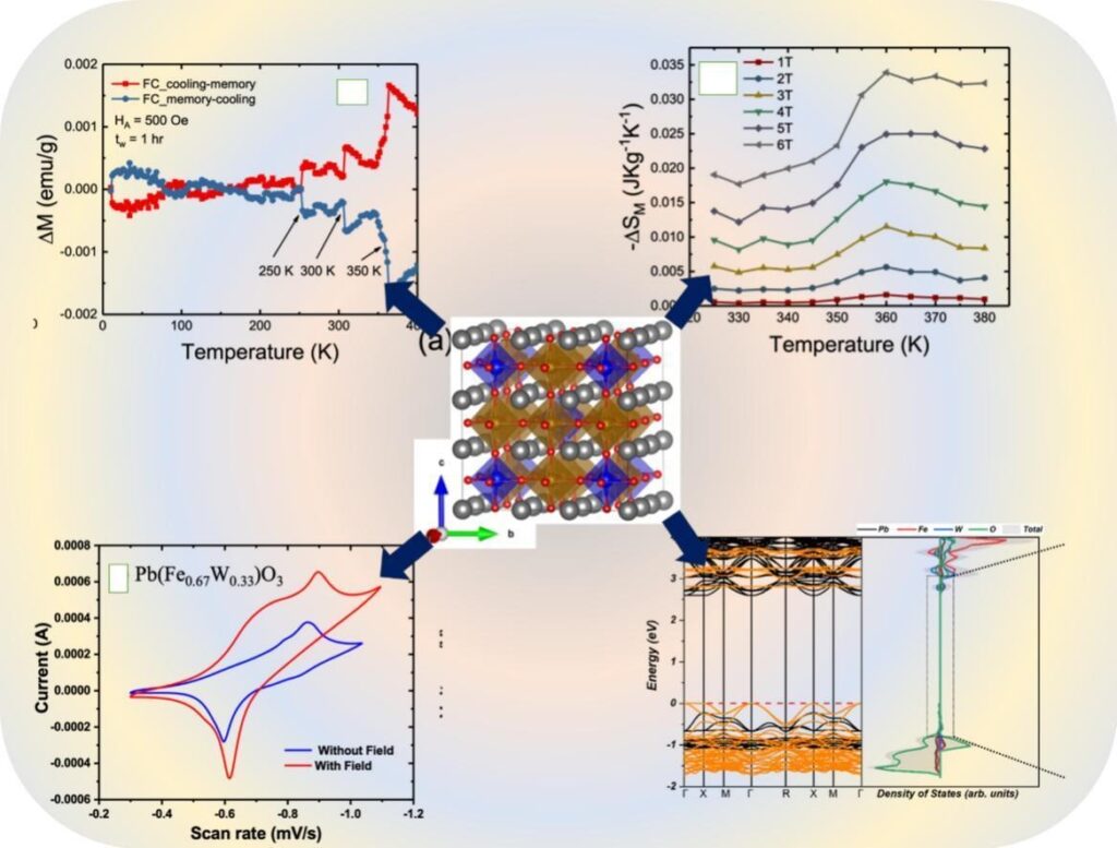 Abstract: The present work reports the a comprehensive study of the structural, magnetic, and electrochemical properties of Pb(Fe₀.₆₇W₀.₃₃)O₃ (PFWO), highlighting its potential as a multifunctional material for room-temperature magnetocaloric, memory, and energy storage applications. Structural analysis via X-ray diffraction (XRD) and Rietveld refinement confirms a pseudo-cubic perovskite structure (space group Pm-3 m), supported by Raman spectroscopy that reveals characteristic A₁g, Eg, and 2F₂g modes due to local lattice distortions. Magnetic susceptibility measurements demonstrate a paramagnetic-to-antiferromagnetic transition at ∼344 K, with weak ferromagnetic ordering below 7 K. The PFWO exhibits a notable magnetocaloric effect, with significant magnetic entropy changes under 1–6 T. Electrochemical performance, evaluated through cyclic voltammetry (CV), galvanostatic charge – discharge (GCD), and electrochemical impedance spectroscopy (EIS), shows a substantial increase (80–110 %) in specific capacitance under a low magnetic field (30 mT), attributed to enhanced charge storage and reduced charge transfer resistance (from 35.47 to 31.59 Ω). Excellent cycling stability is observed over 10,000 cycles. Density functional theory (DFT) calculations were performed and corroborated well with the structural, electronic, vibrational, and magnetic properties of PFWO. The increased specific capacitance is well supported by DFT calculations, attributed to structural disorder or instability. Overall, PFWO is a promising multifunctional multiferroic material with potential applications in room-temperature refrigeration, magnetic memory, and supercapacitors.