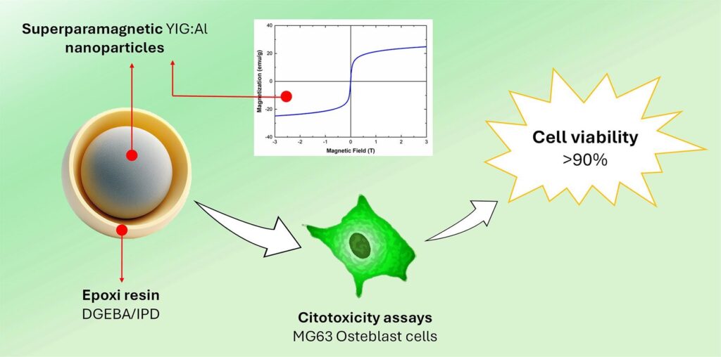 Abstract: In this study, the structural, magnetic, and cytotoxicity towards MG63 osteoblasts-like cells of epoxy/Y3Fe5O12: 1.6 wt% Al (YIG) nanoparticles were investigated. The nanoparticles crystallized in the garnet structured of YIG without secondary phases. The magnetization curve indicated the sample is superparamagnetic, with reduced residual magnetization and coercivity field (0.80 emu/g and 3.7 mT) and magnetization saturation of 24.47 emu/g, which are desirable characteristics for biomedical applications. Cytotoxic studies were performed to investigate if the nanoparticle encapsulation with DGEBA and IPD were effective in promoting cell viability, using MG63 osteoblast-like cells as a model. The results showed cell viability of >90 %, indicating that the Al-doped YIG encapsulation with DGEBA and IPD are promising methods to enhance its biocompatibility aiming in vivo applications, such as hyperthermia treatment.