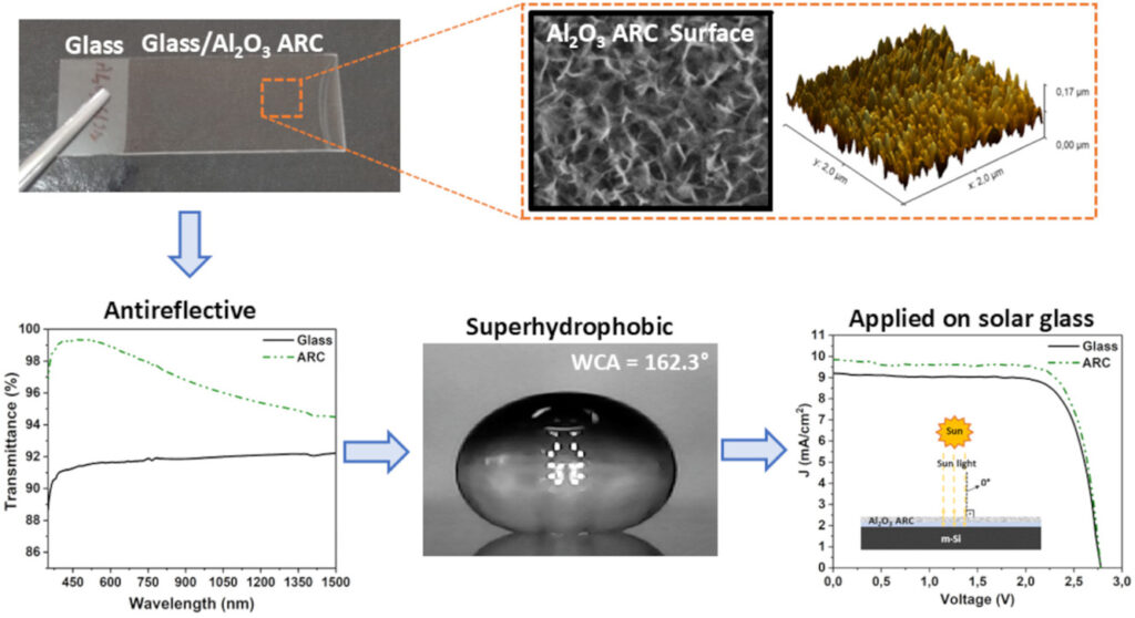 Abstract: This study developed a multifunctional aluminum oxide (Al2O3) film combining anti-reflective and superhydrophobic properties for enhanced photovoltaic (PV) performance in outdoor applications. The film was created on glass substrates using a sol–gel, dip coating, and controlled etching process, resulting in a porous surface with grass-like nanostructures. After 512 s of etching, the film achieved a roughness of 23.63 nm and a refractive index of 1.14 at 550 nm. It demonstrated excellent broadband anti-reflection, with 96.86% average transmittance and 3.07% reflectance across the 350–1500 nm spectrum, peaking at 99.30% transmittance at 480 nm. The film maintained over 90% transmittance at angles up to 45°, providing omnidirectional functionality crucial for solar panels. Its superhydrophobicity (162.3°water contact angle and hysteresis 7.5°) ensures self-cleaning. When applied as a solar cell cover glass coating, the film enhanced short-circuit current density and power conversion efficiency. A 19.19% efficiency increase was observed at a 60°incidence angle, demonstrating the film’s potential for significant PV performance improvement.